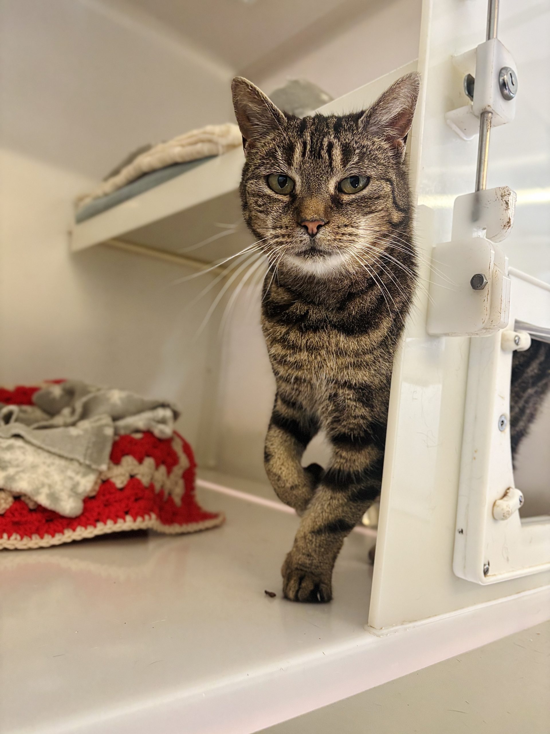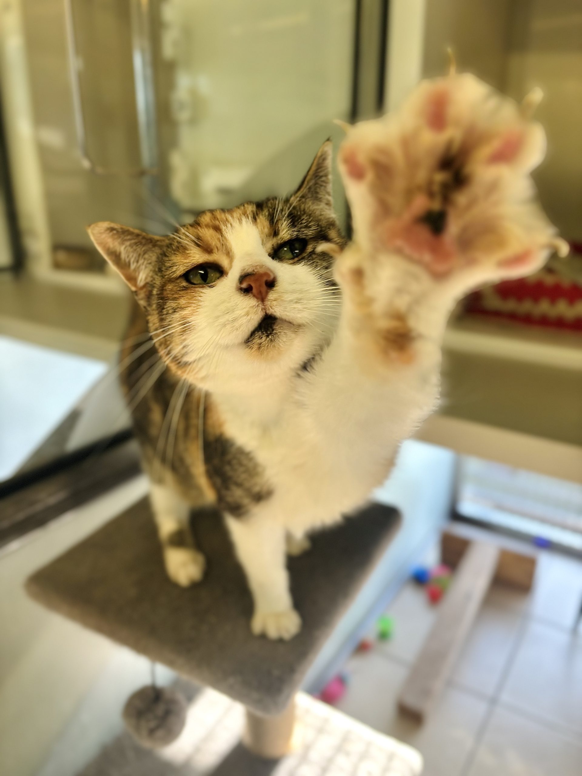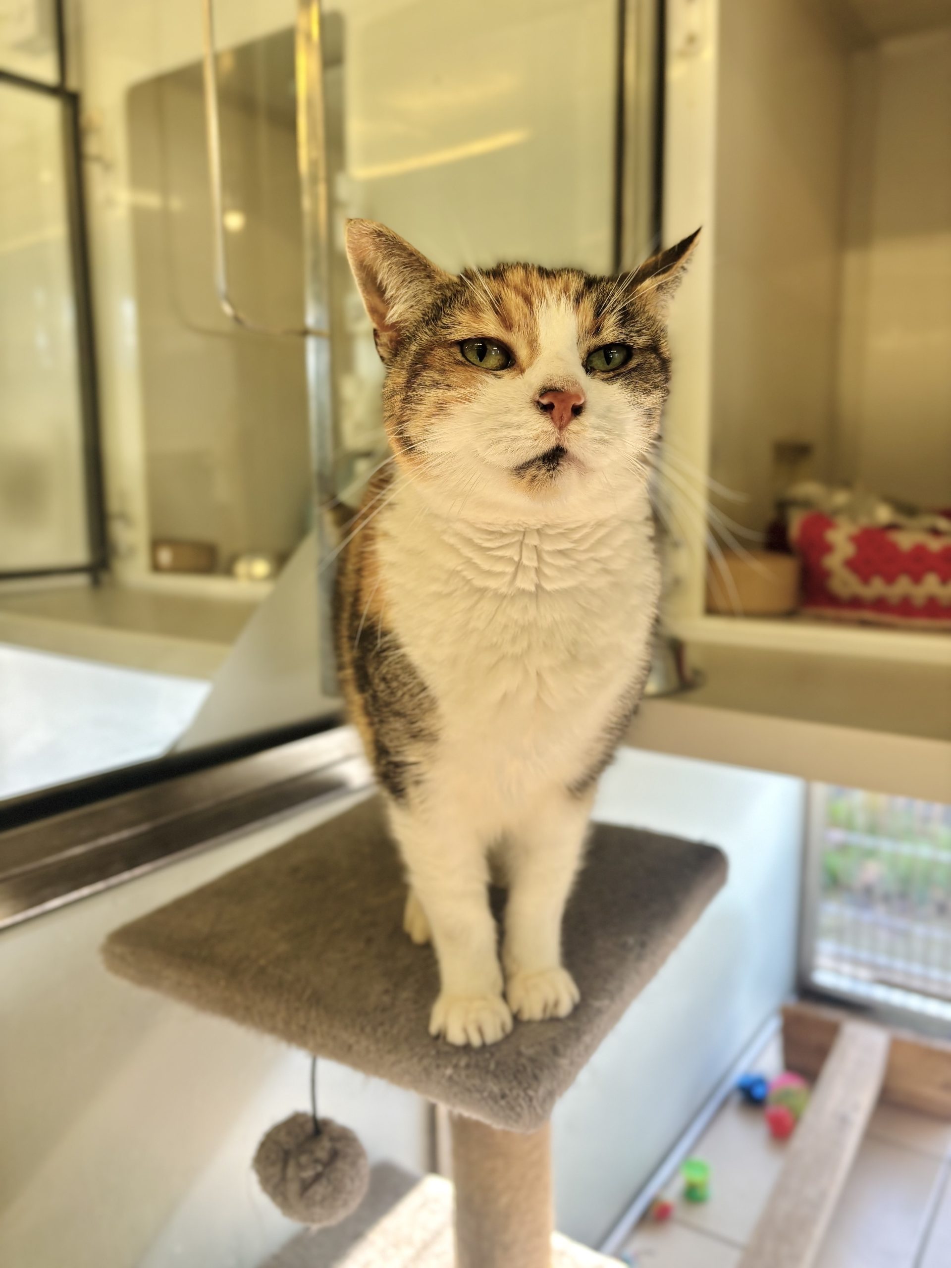 After transitioning from a home environment to a small cabin, Nori has been a bit dominant and occasionally asserts herself over Maeve if she gets too close. While neither cat is harming the other, it’s clear that Nori takes the lead in their current dynamic. Both cats are still being assessed, and we will continue to monitor their progress to see how their personalities develop while in our care.