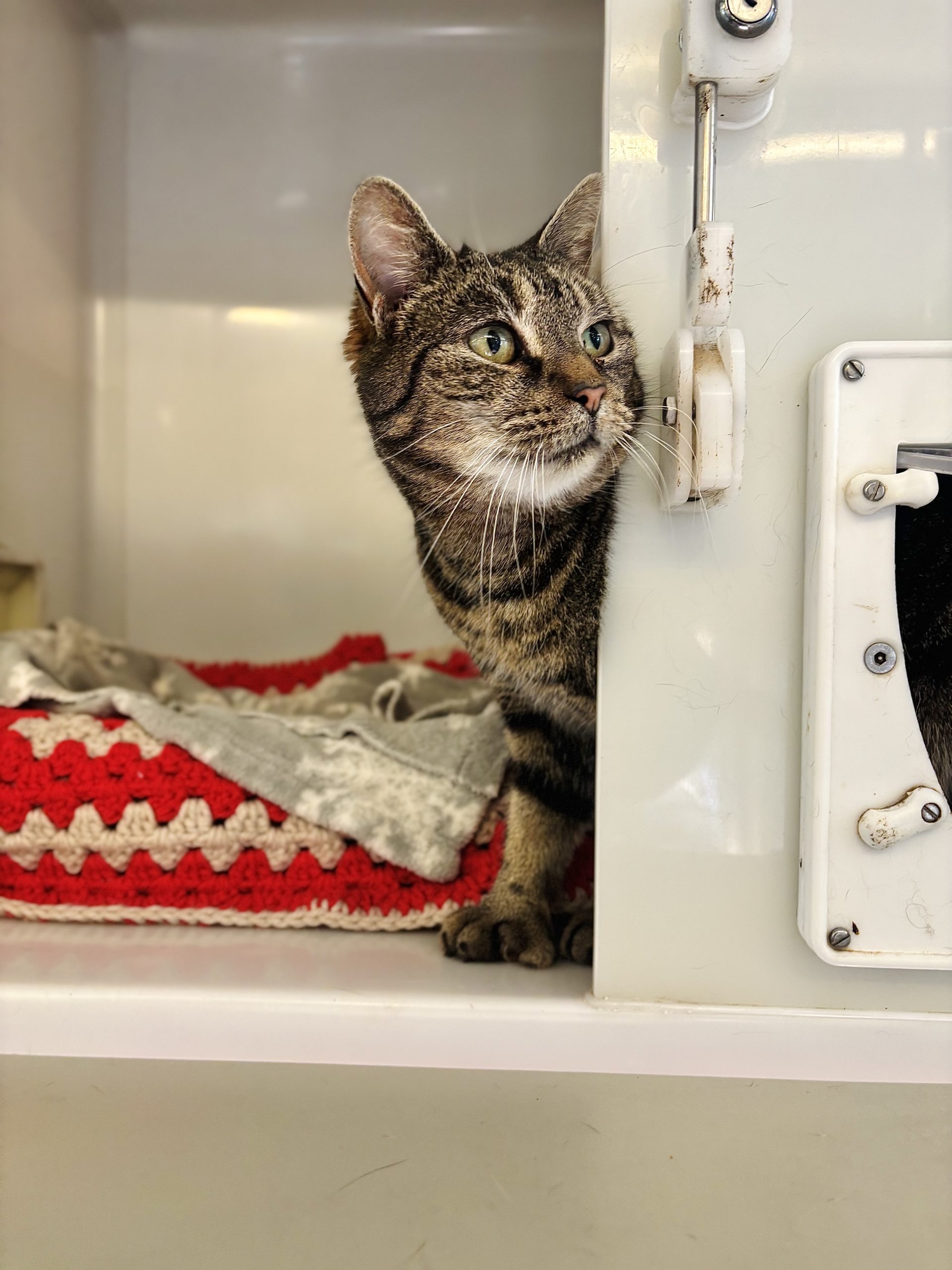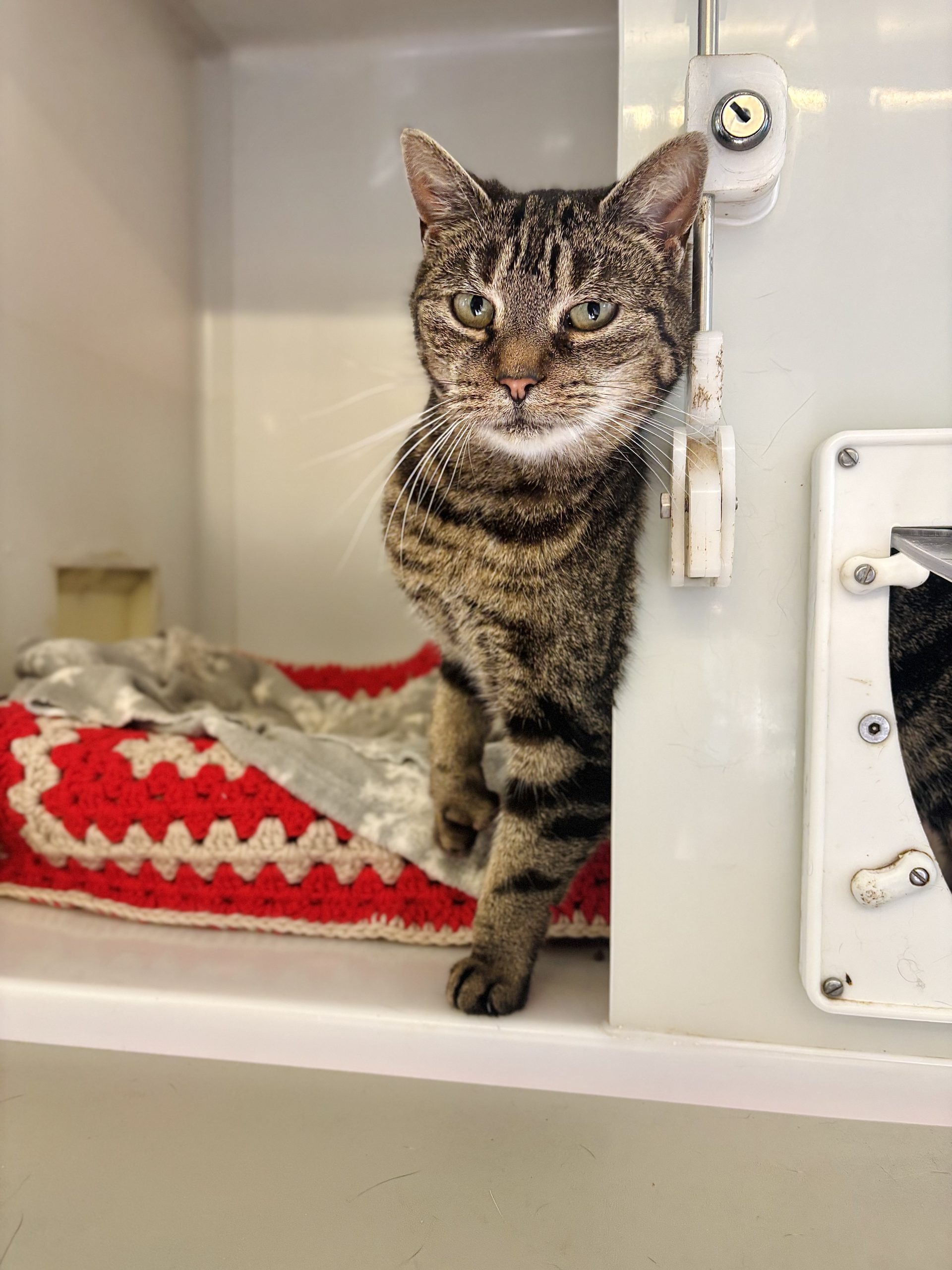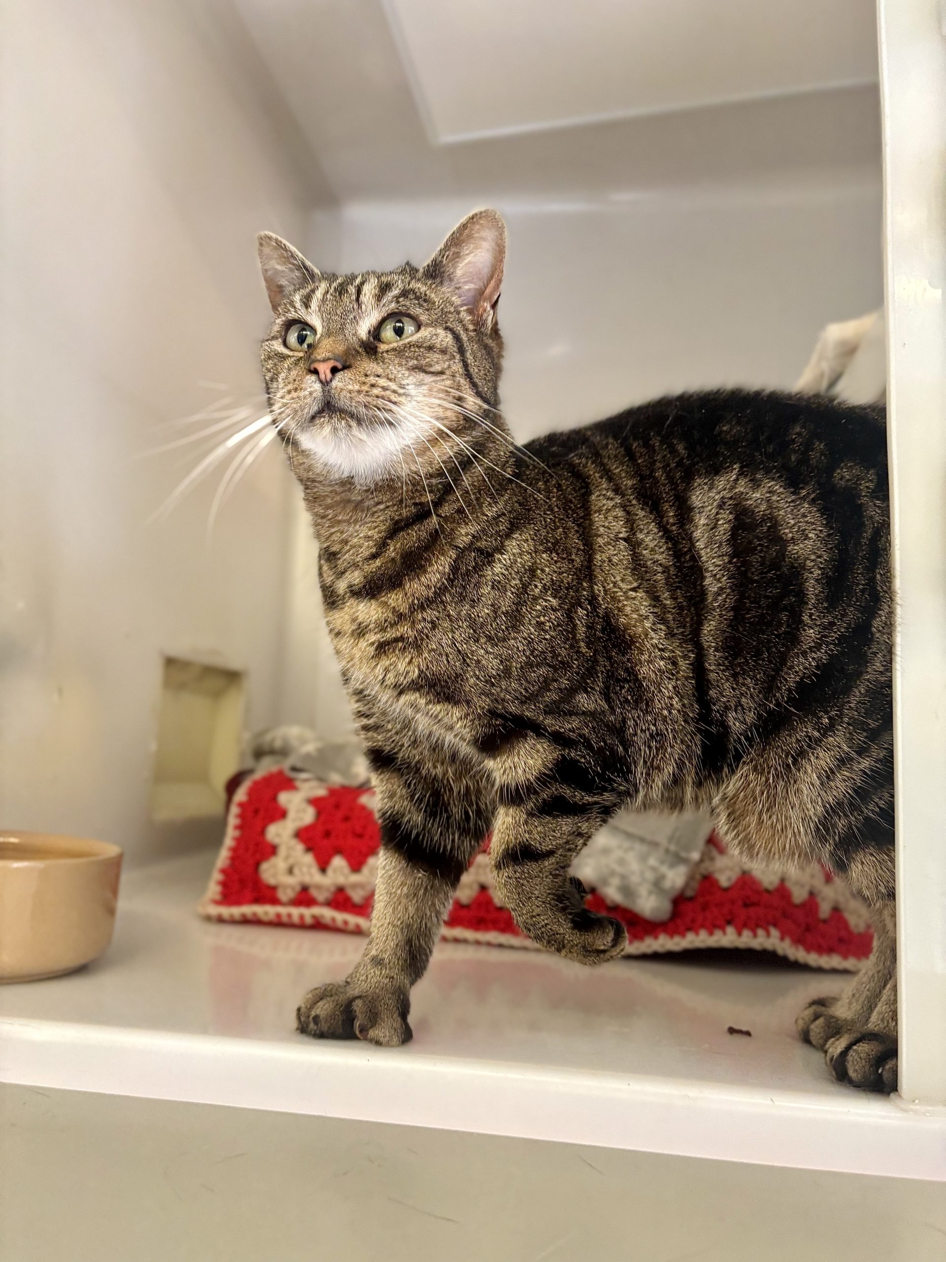 After transitioning from a home environment to a small cabin, Nori has been a bit dominant and occasionally asserts herself over Maeve if she gets too close. While neither cat is harming the other, it’s clear that Nori takes the lead in their current dynamic. Both cats are still being assessed, and we will continue to monitor their progress to see how their personalities develop while in our care.
