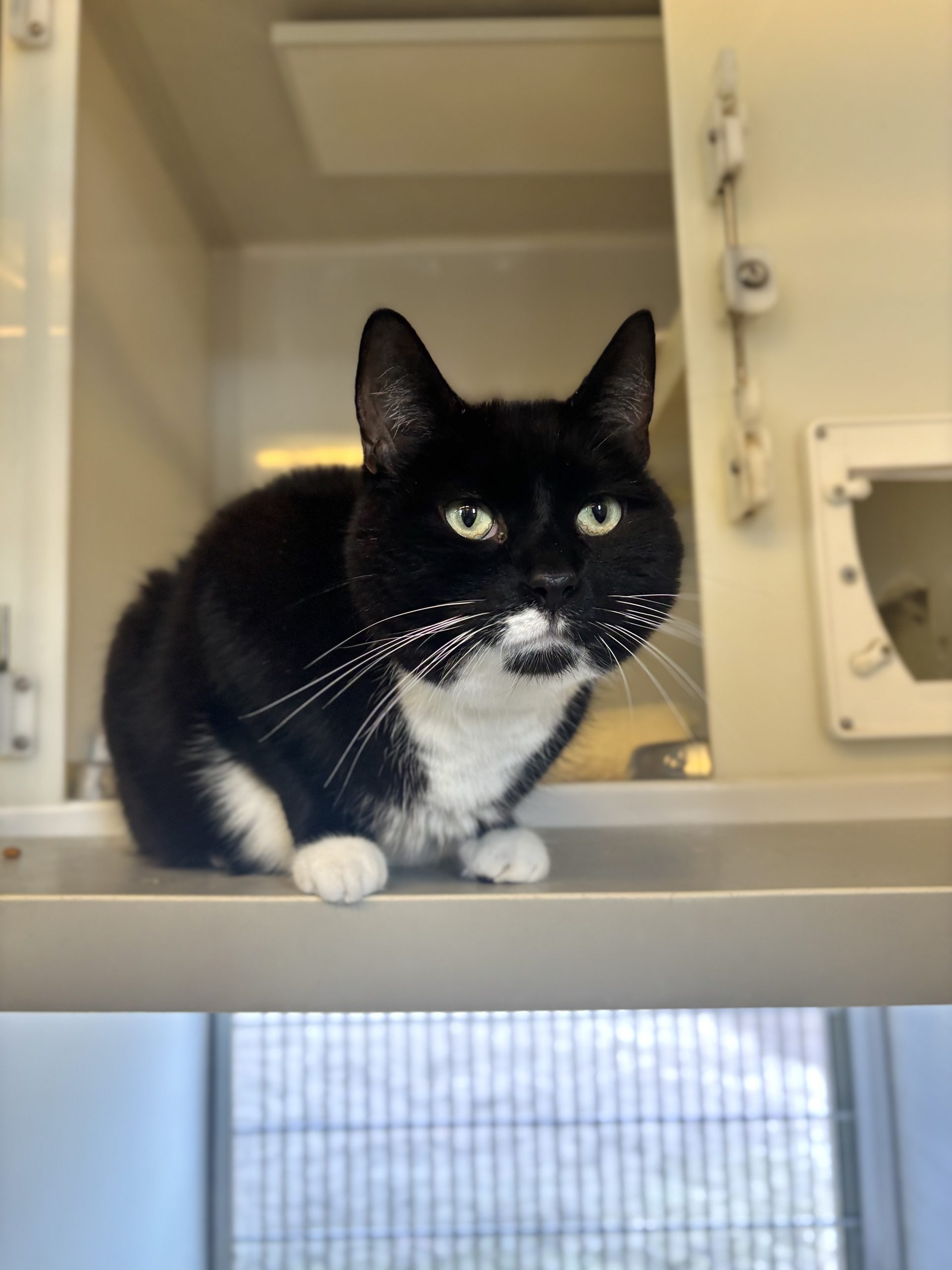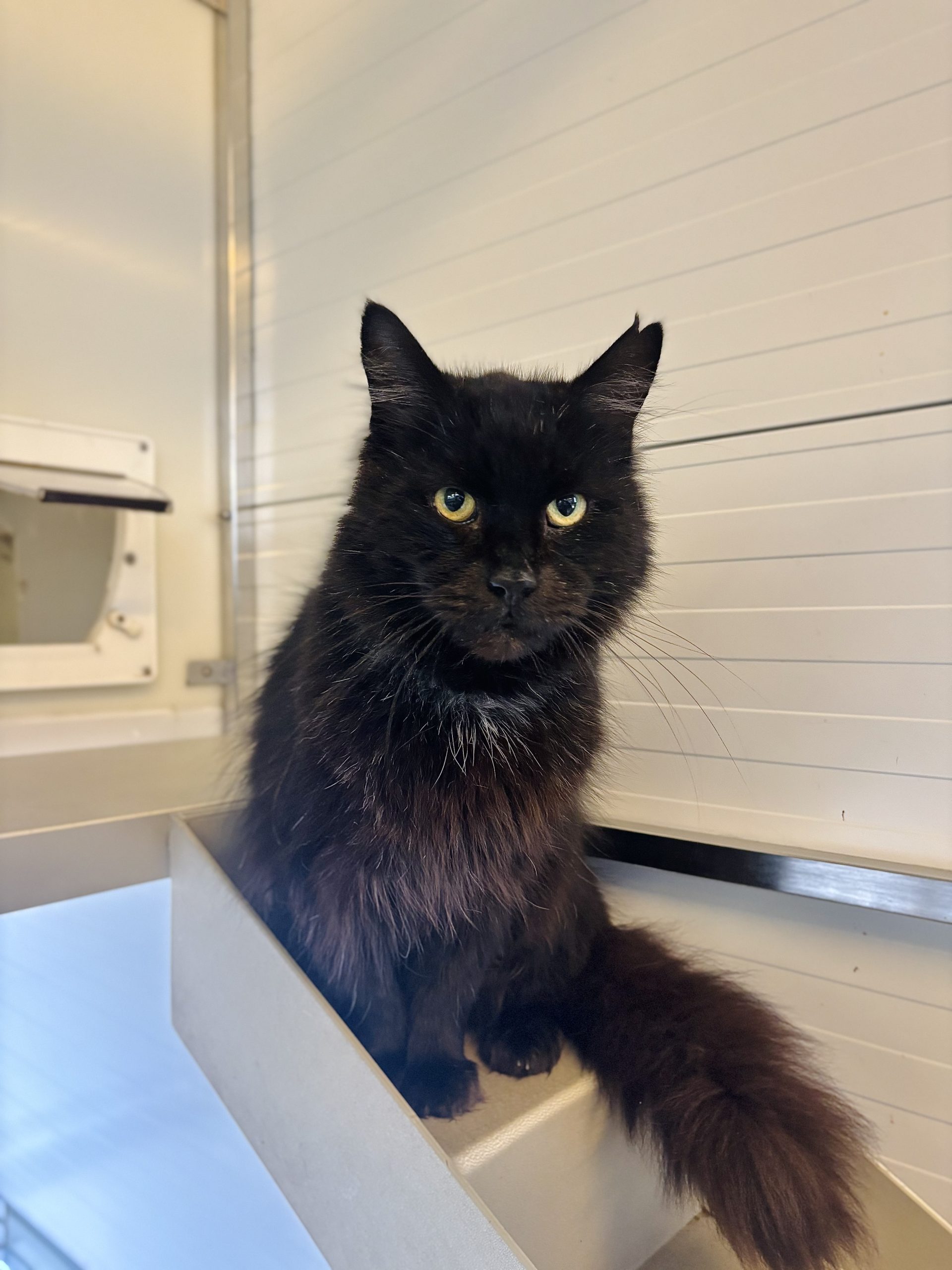 Sooty, the older of the duo, has a sleek black coat and a calm disposition. He tends to be quieter and more reserved compared to his lively companion, Sweep. Sooty enjoys his Dreamies and will approach for affection when he feels comfortable. Please keep in mind that these observations are only based on their behaviour in a cattery setting.